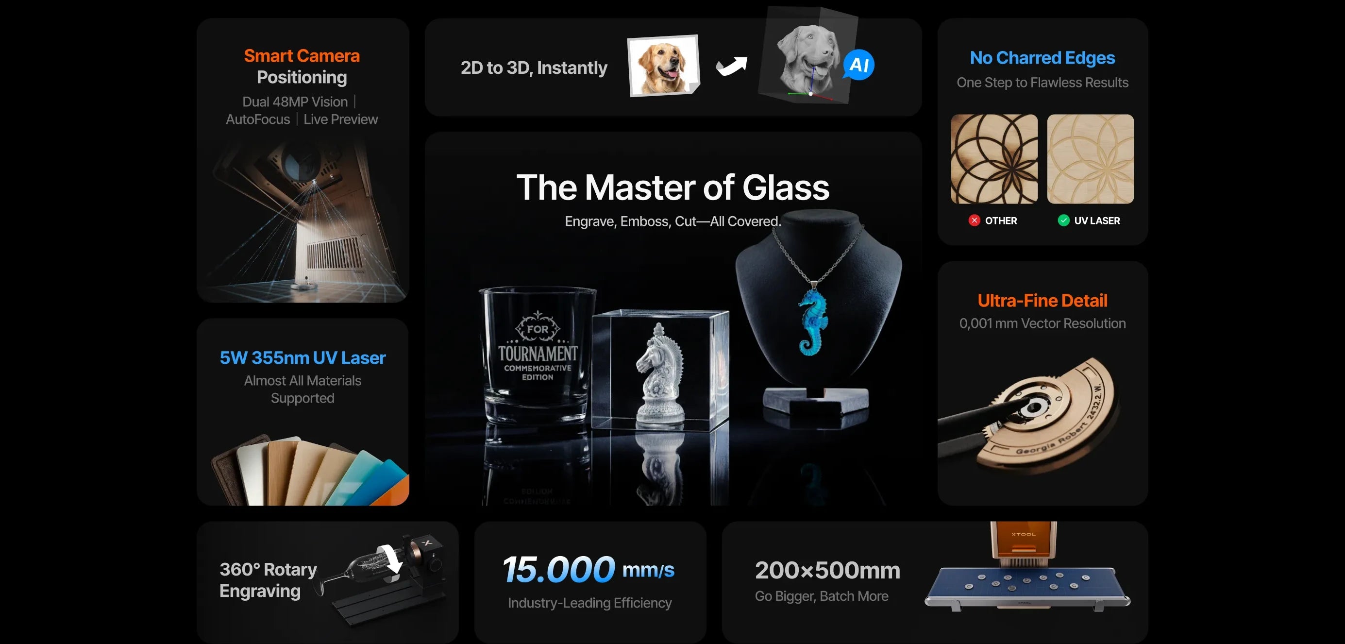 Think 3D inner engraving is complex? Think again. Powered by xTool's professional AI agent, we offer the simplest all-in-one solution—turn text or 2D into 3D with one click and enjoy stunning results in minutes.