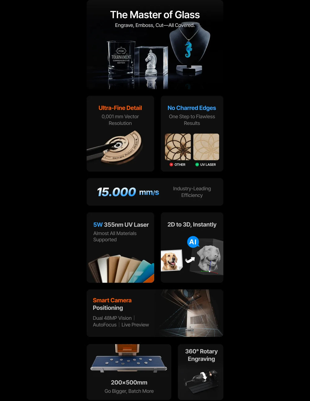 The industry's first dual-camera UV laser system. Two cameras handle automatic positioning and focusing, achieving 0.2 mm accuracy—60% more precise than single-camera systems. Every process is consistently effortless, and every detail is exactly as you imagined.