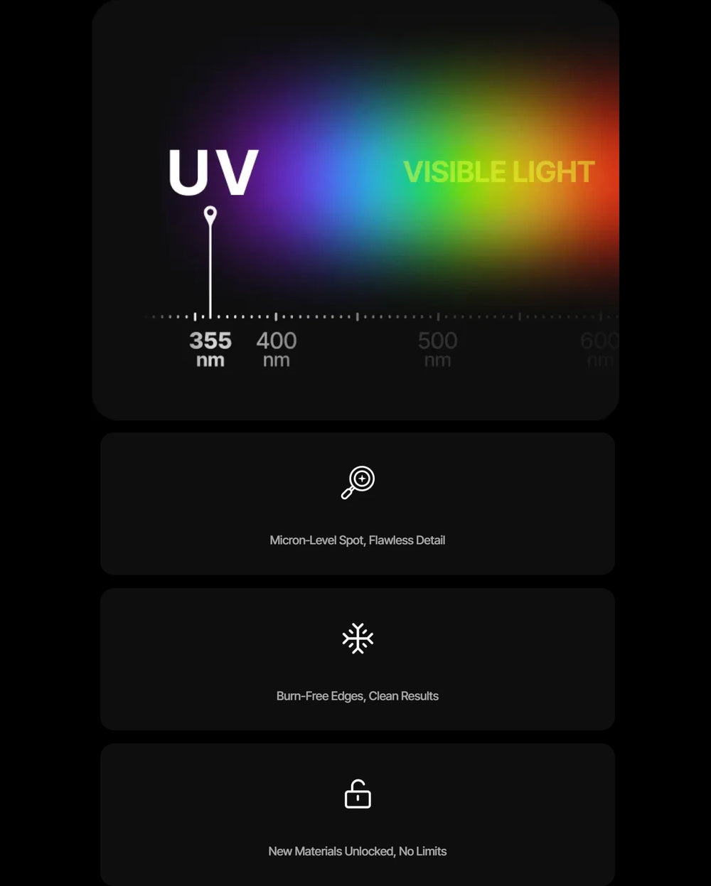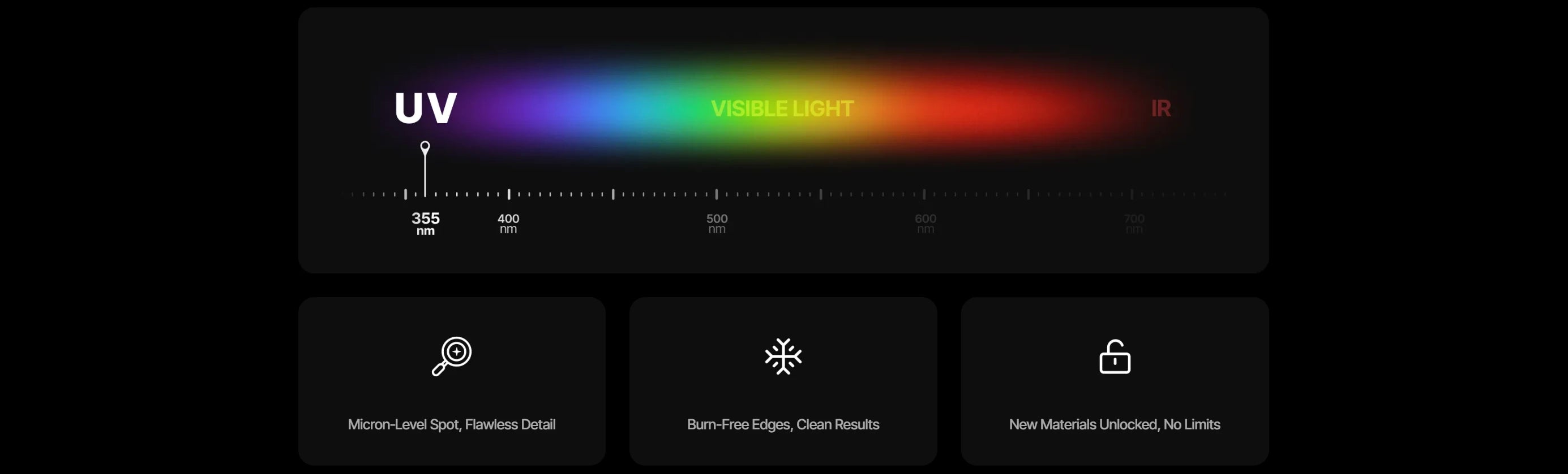 UV lasers have a short wavelength and high-energy photons, which directly break molecular bonds with very little heat. This “cold processing” delivers much higher energy density and precision than traditional heat-based lasers.