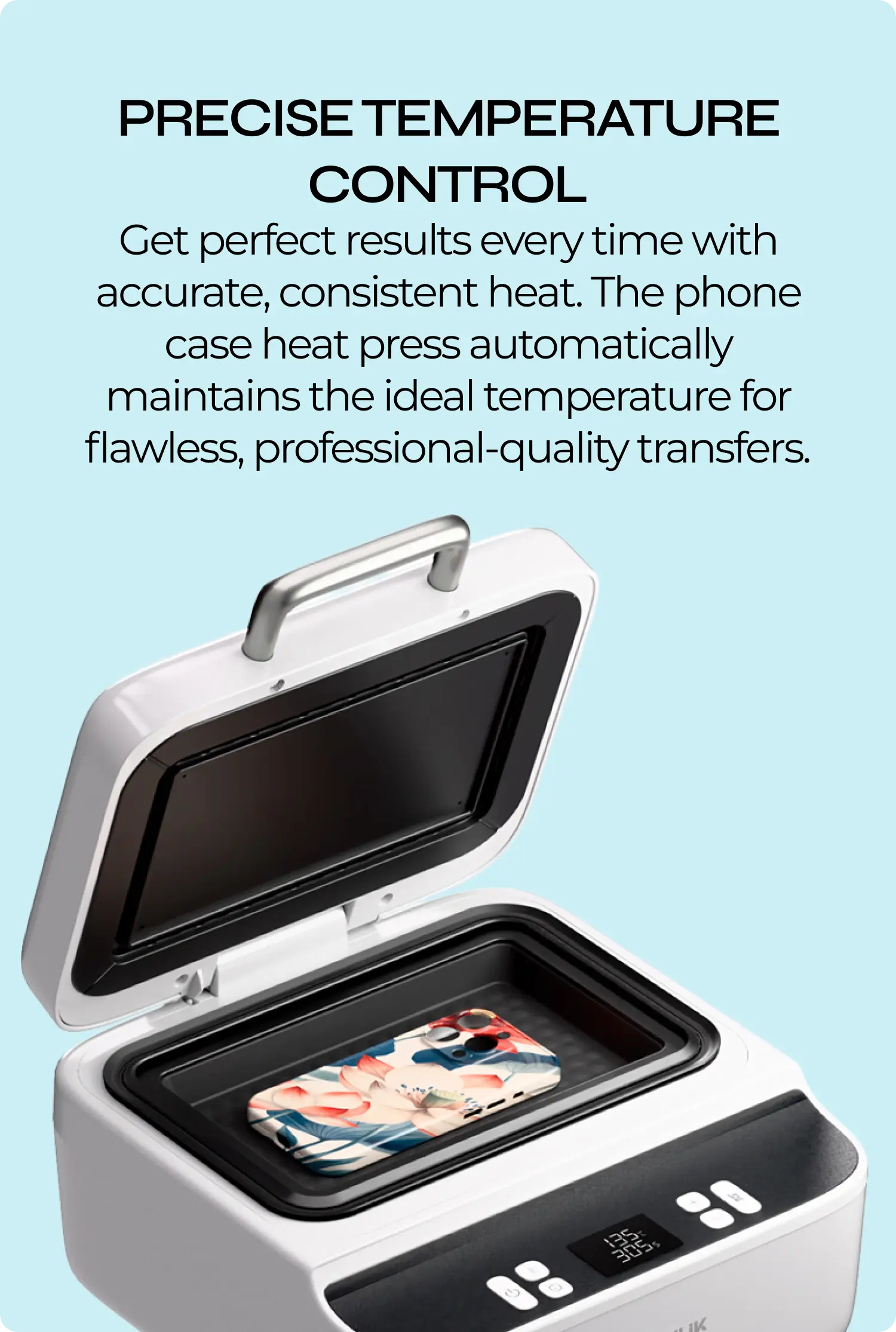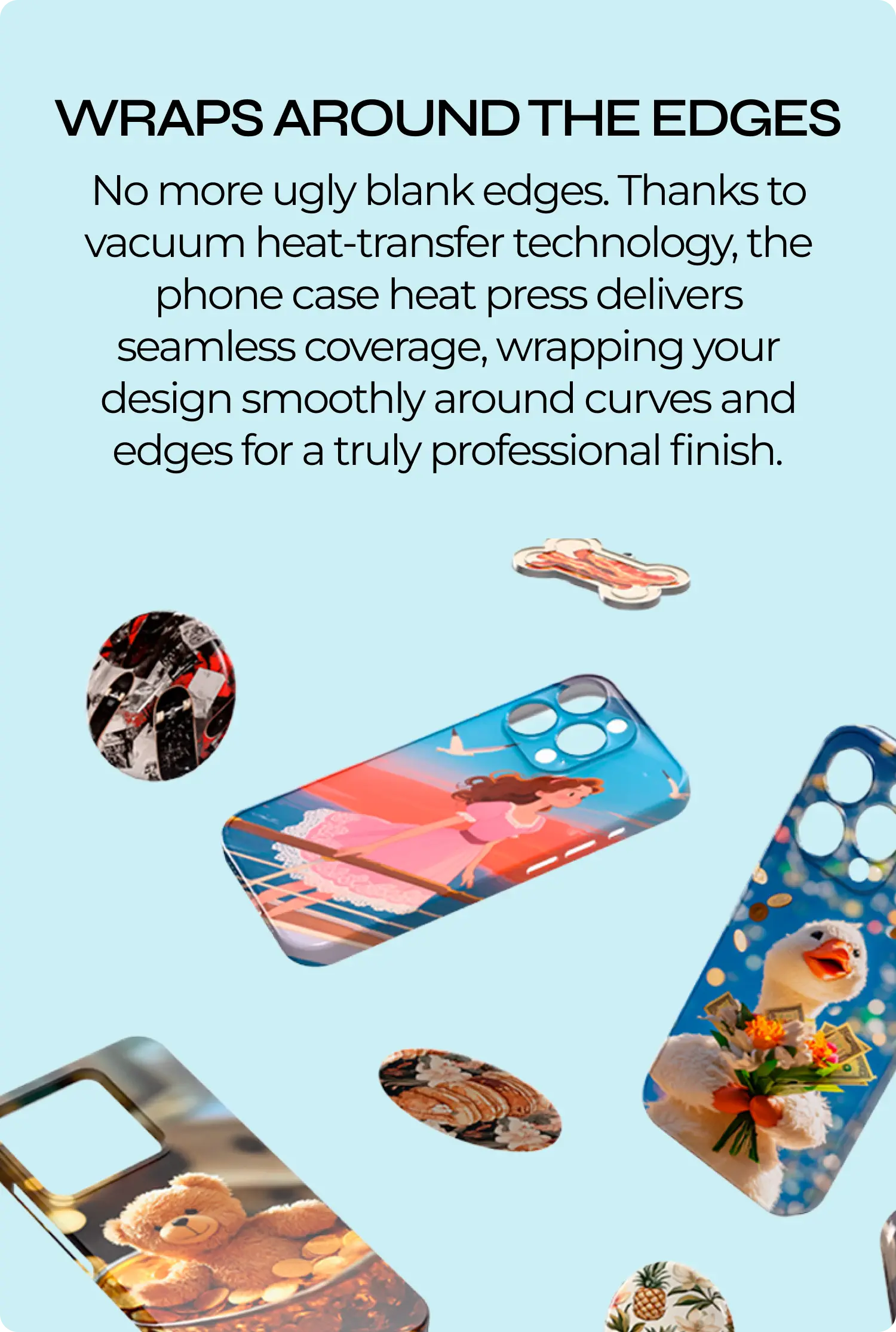 Achieve stunning, full-coverage transfers with the phone case heat press’ powerful vacuum heat-transfer system. It delivers vibrant, true-to-life colours that perfectly hug curves and edges, making every print look flawless.