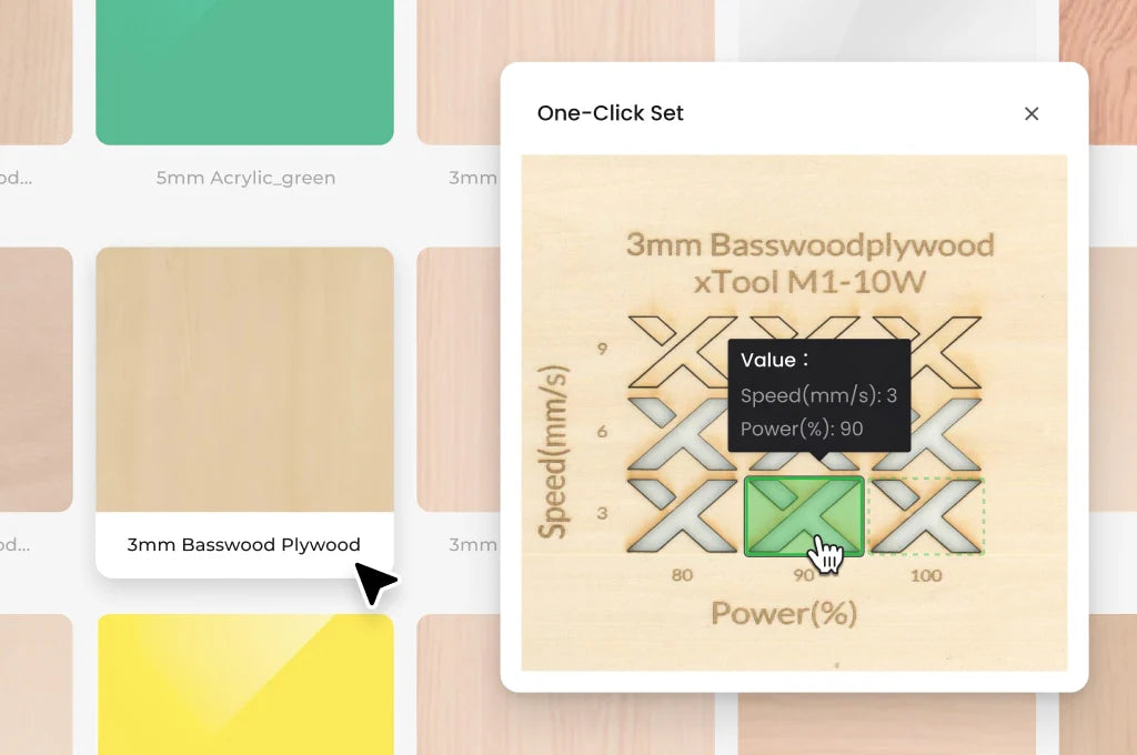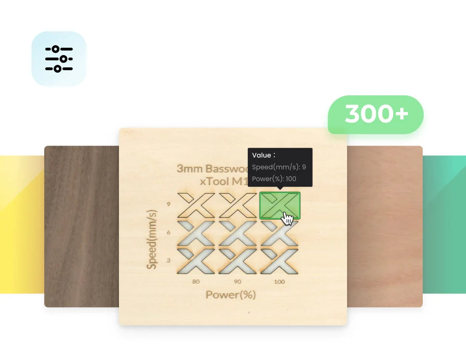 Covering all xTool Selected materials, ever-growing, tested across all machines and processing types. Say goodbye to time-consuming testing grids.
