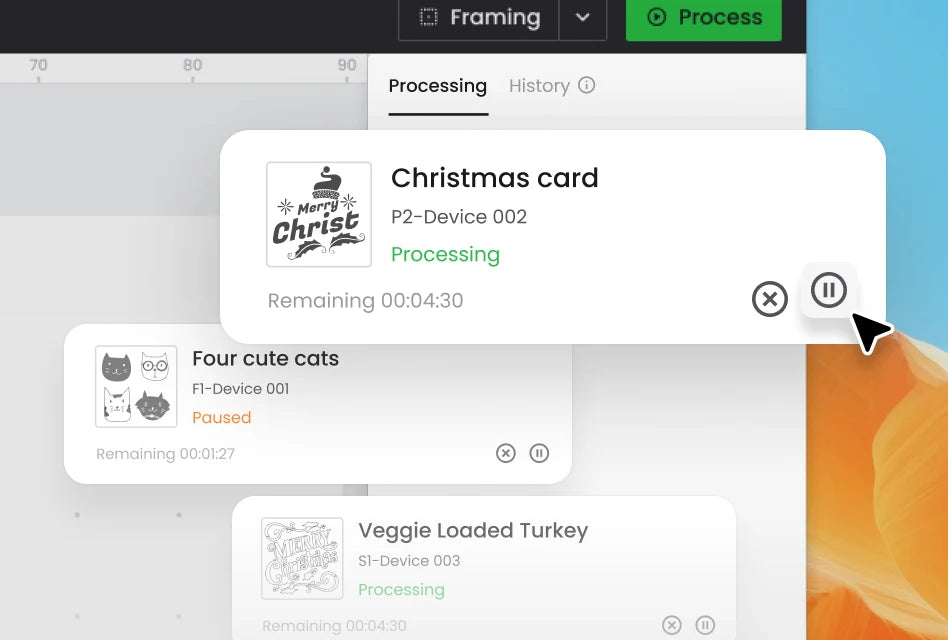 Oversee all machines and projects simultaneously, get real-time progress updates, and edits while processing. You're in charge, from start to finish.