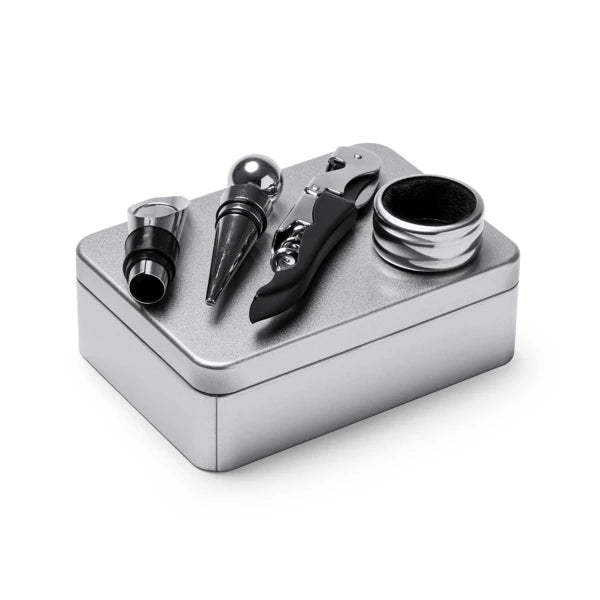 Σετ με αξεσουάρ από ανοξείδωτο ατσάλι που περιλαμβάνει τιρμπουσόν τύπου pulltap με πτυσσόμενη λεπίδα, δαχτυλίδι κατά των σταγόνων, πώμα και ρύγχος σερβιρίσματος.