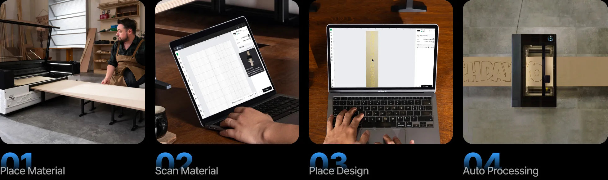 Using high-resolution images captured by the P3's camera, our AI algorithm seamlessly stitches a complete preview of your entire material, eliminating all guesswork for accurate, effortless alignment.