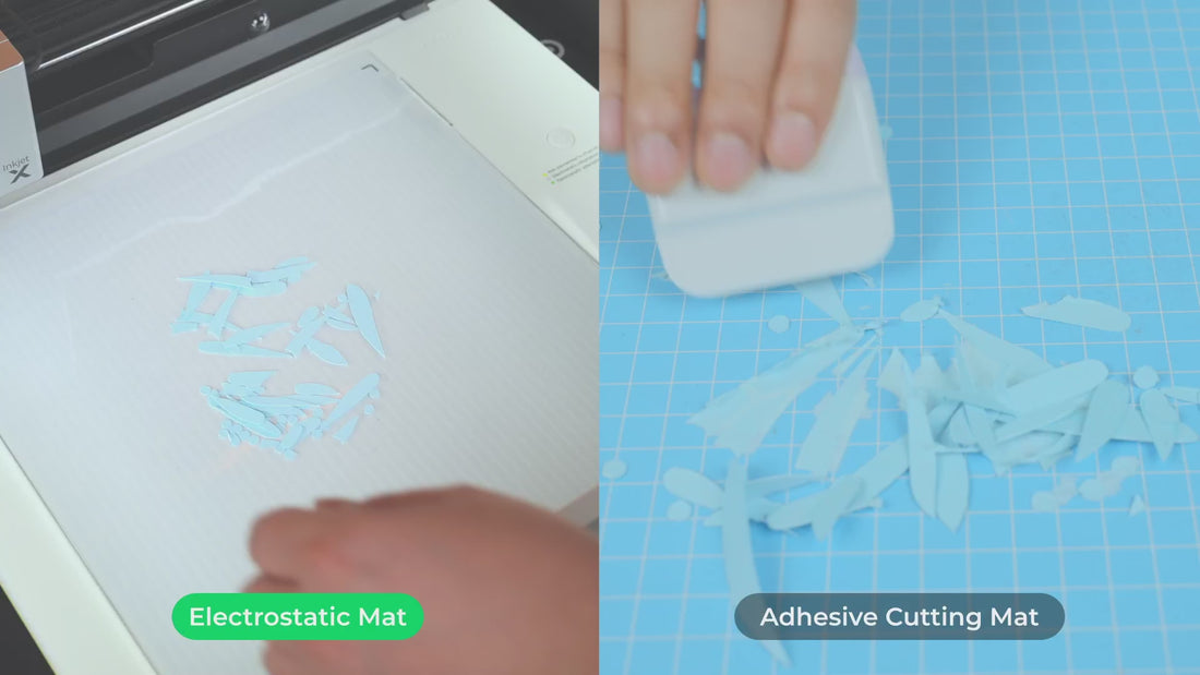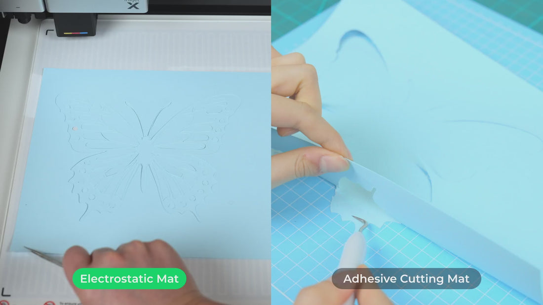 The Electrostatic Mat is very easy to weed and clean, making it suitable for cutting fine patterns. However, for very small materials (less than 2mm), the insufficient contact area can lead to inadequate adhesion, causing the cutting elements to shift during the process.
