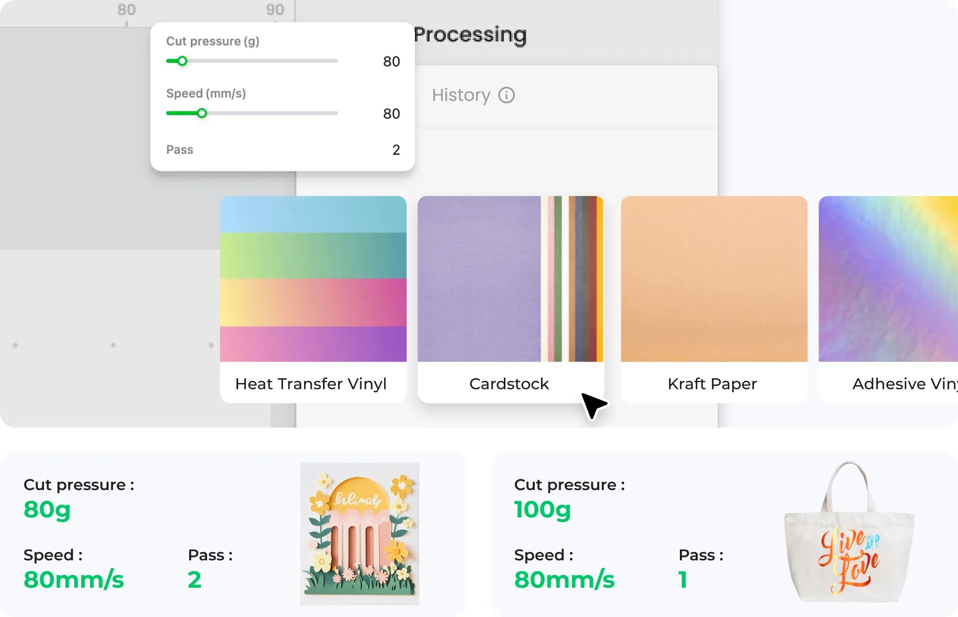 Simply select your material and mode to apply the built-in parameters to achieve perfect results without worrying about incomplete cuts or poor quality.