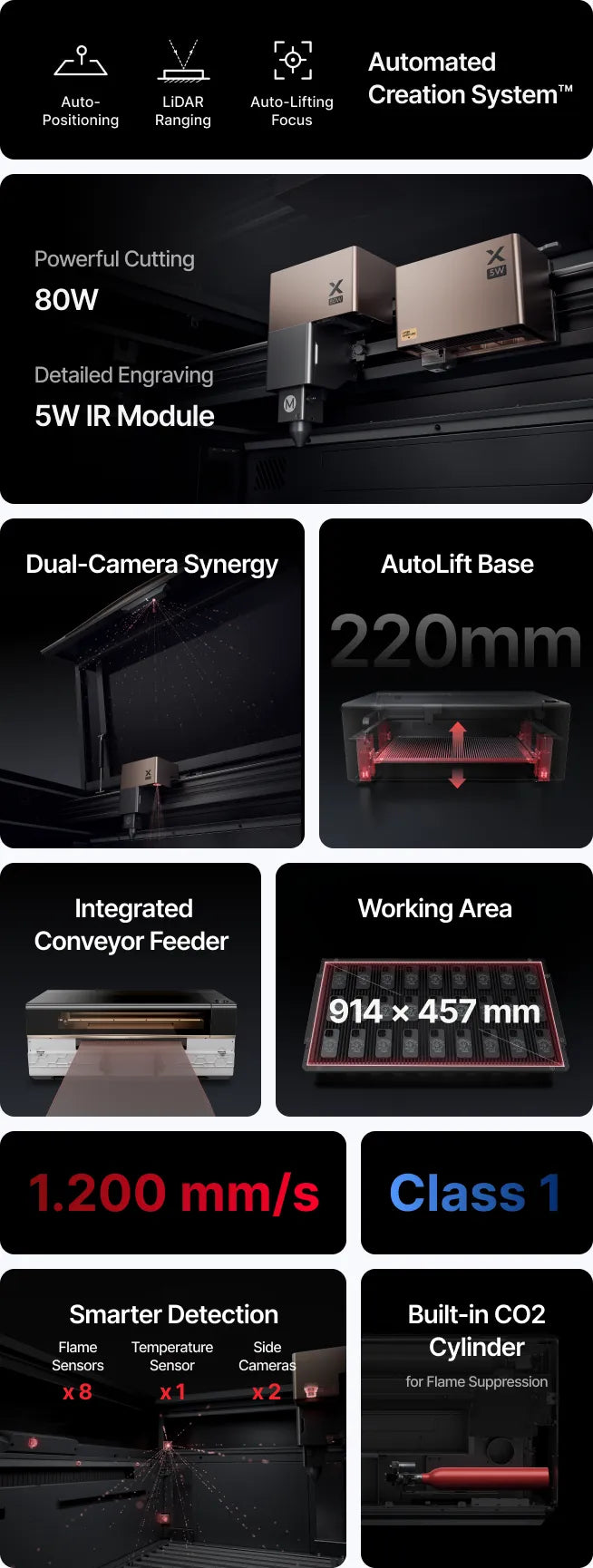 Designed for professionals, this system combines 4-camera vision, ACS™ Smart Workflow, and smart accessories with a 914 × 457 mm bed—2.2x larger than the P2S. With 80W power and 1200 mm/s speed, it ensures faster production, higher output, and dependable performance.