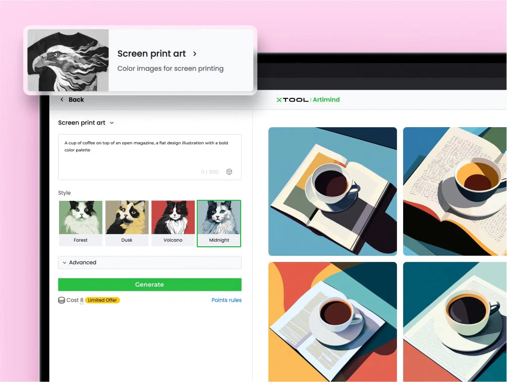 xTool's XCS software offers an AI design tool for screen printing. Just input a few words, and it instantly creates stunning graphics ready for your projects!